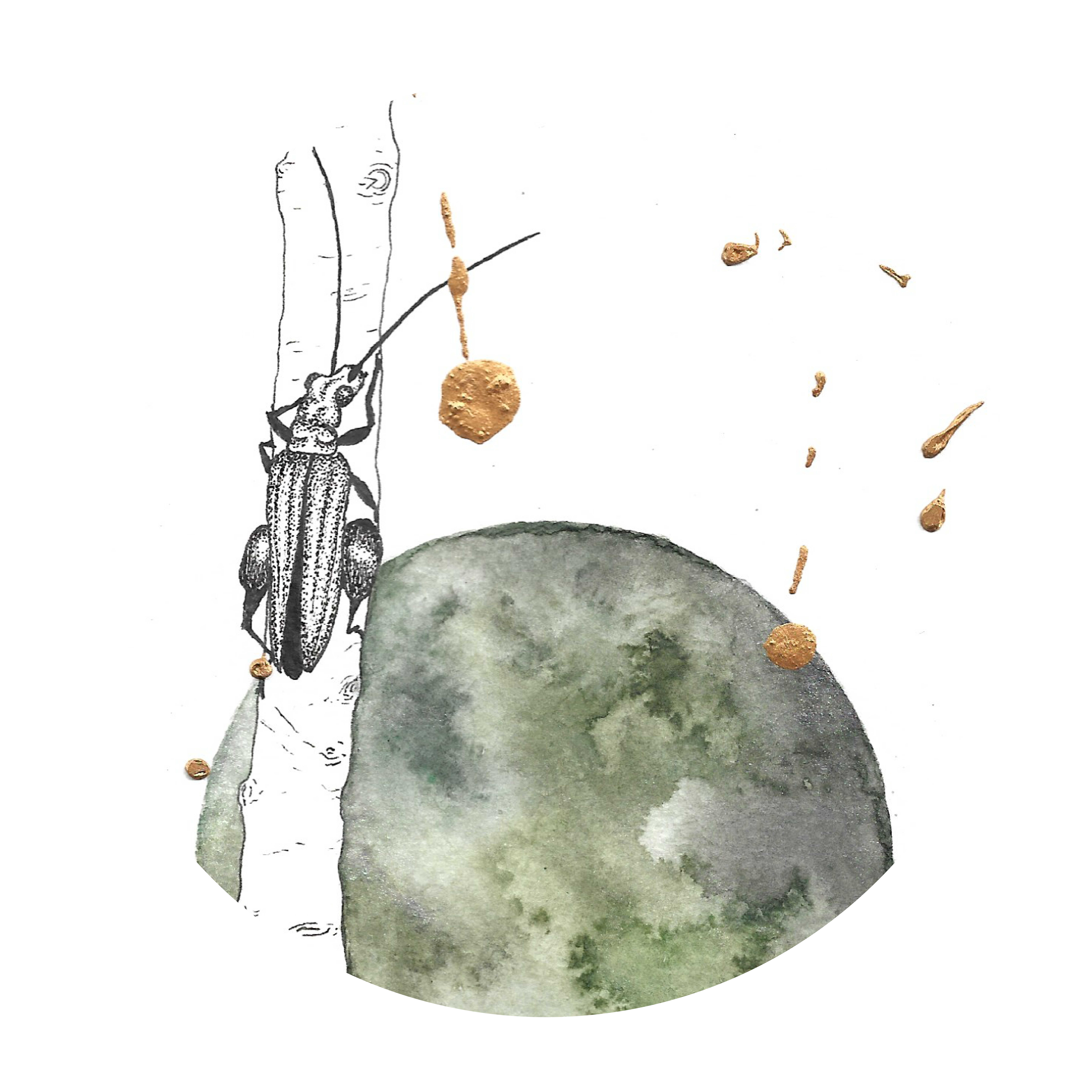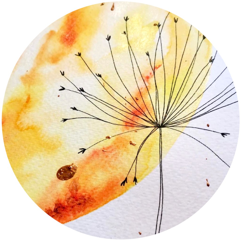 Parfois, je ne suis pas satisfaite du résultat d’une peinture, je trouve qu’elle manque de relief ou d’originalité. Je la range donc dans un cartable et l’oublie… jusqu’au jour où je prends le temps de passer en revue le contenu de ces cartables et que mon oeil soit attiré par cet akène d’érable à la planète d’or. Parfois il suffit de mettre un passe-partout et d’encadrer une peinture pour lui donner toute sa dimension et qu’elle puisse enfin vibrer.