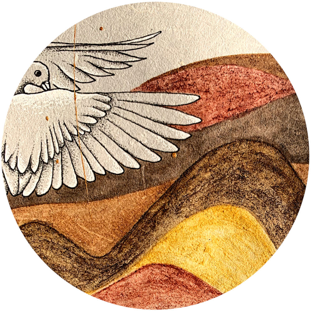 En leur mémoire, et pour ma mère, j’ai peint « Ad Astra » avec mes encres végétales et j’ose croire qu’ils veillent sur nous, telles ces colombes sur une planète faite de dunes.