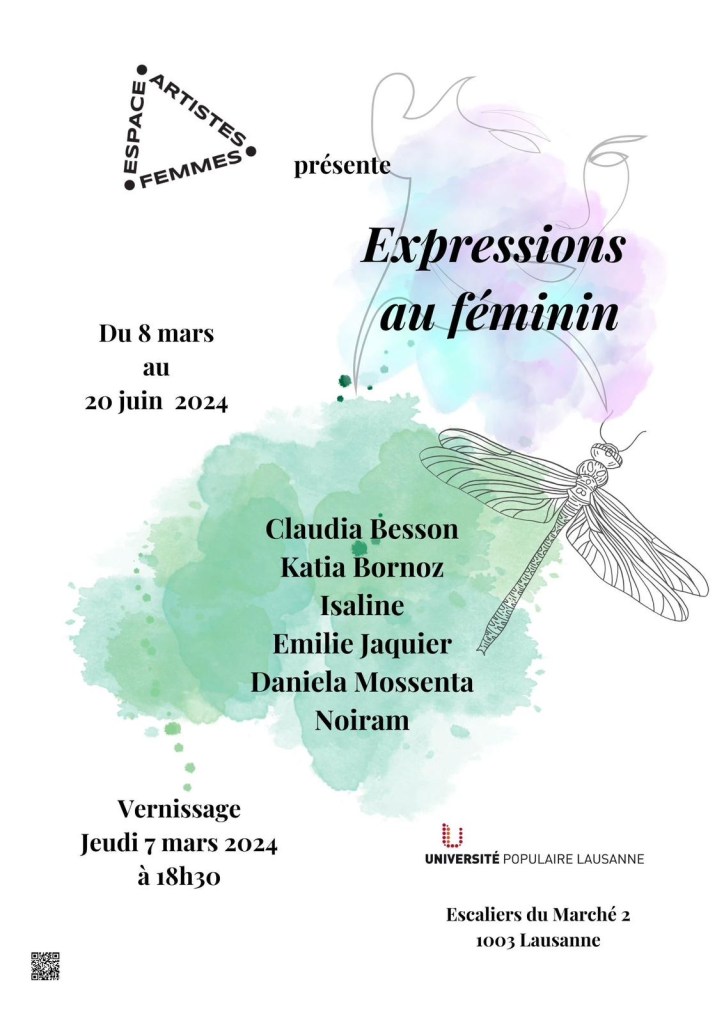 J’expose 3 tableaux dans les locaux de l’Université Populaire de Lausanne avec 5 autres membres de l’association Espace Artistes Femmes.