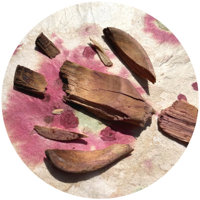 Ici, j’ai utilisé de la rouille, de l’herbe de millepertuis, des fleurs de dahlia pourpres, des fleurs de lys oranges, des feuilles d’épinard, des baies de sureau et des racines d’orcanette.