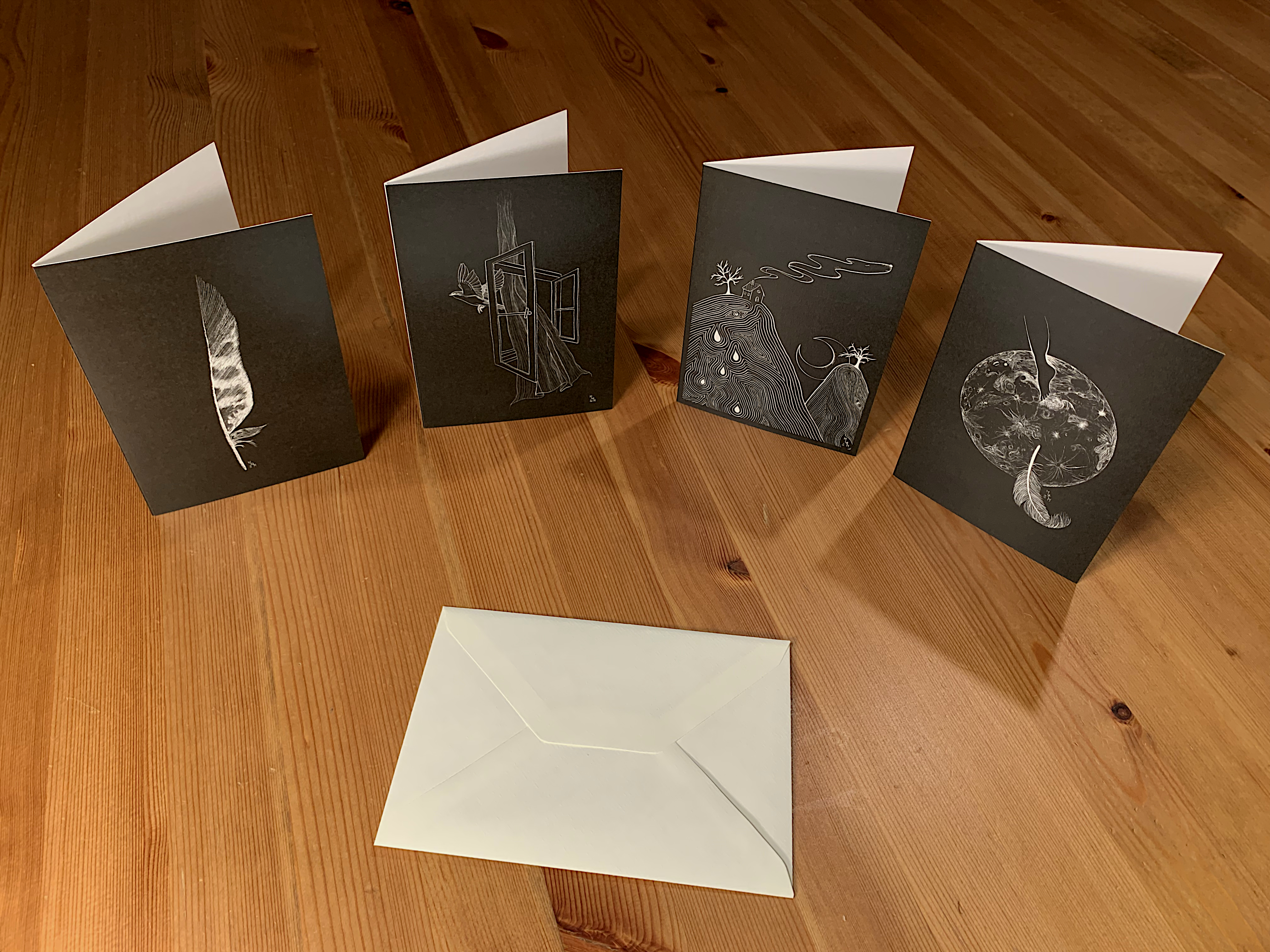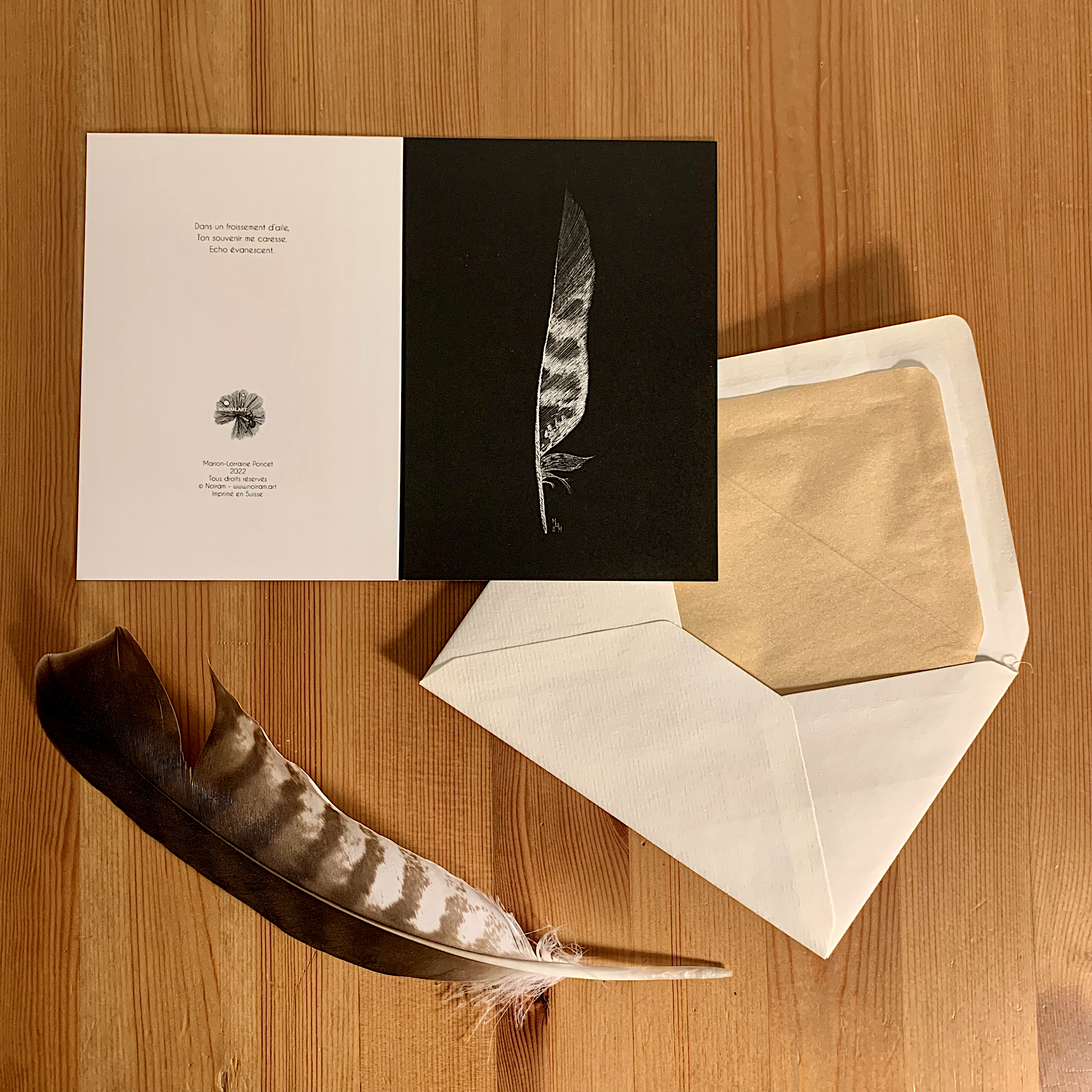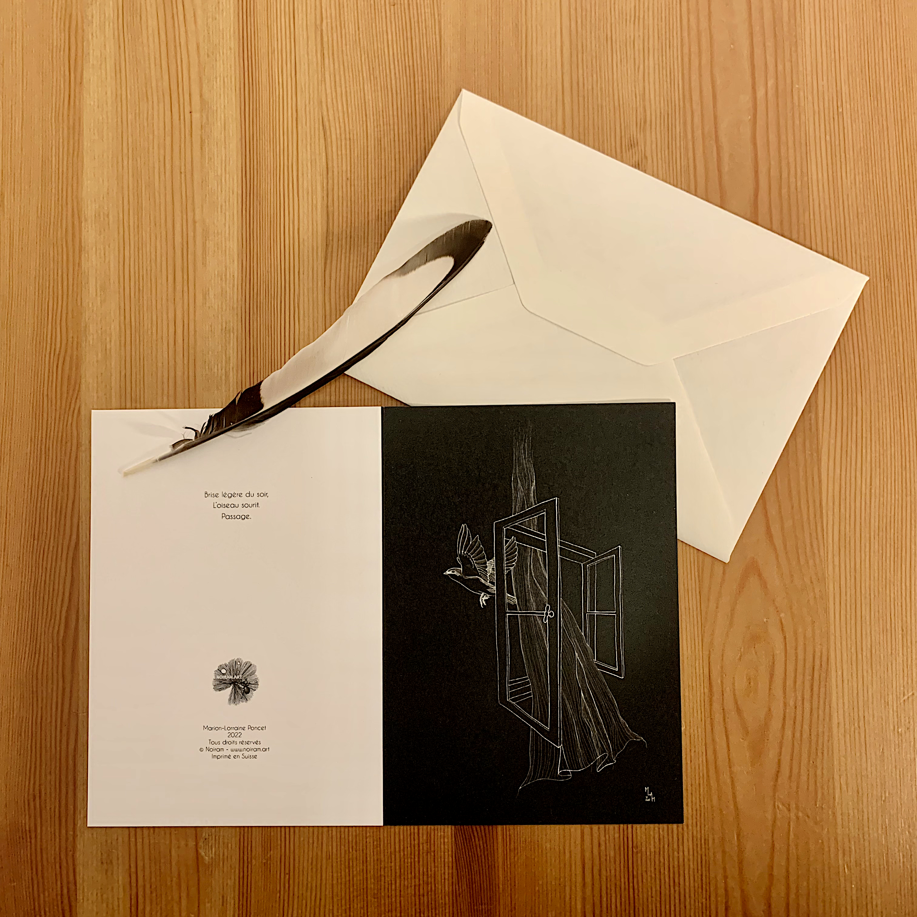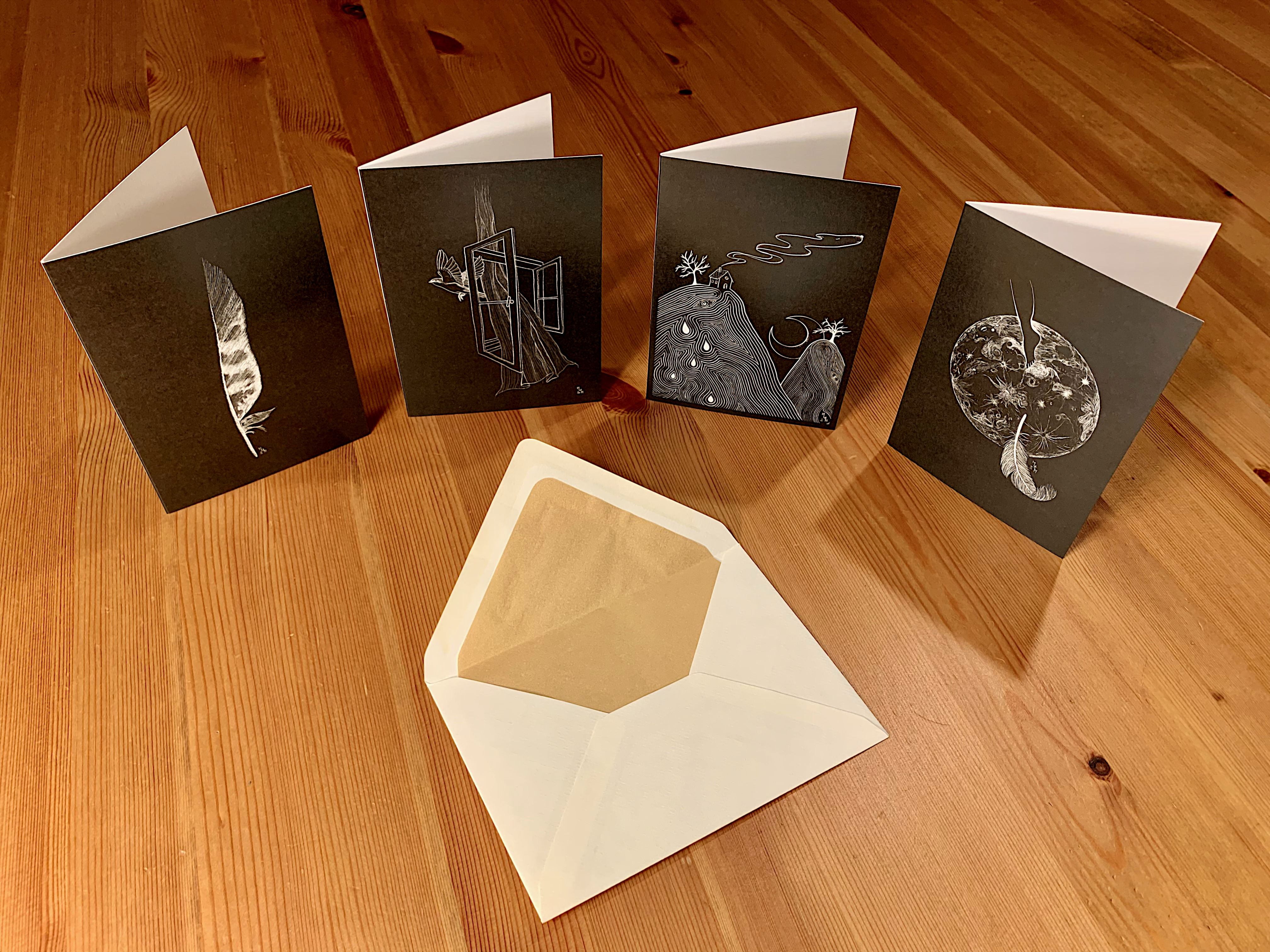 C’est avec tout ceci en tête que j’ai illustré ces quatre cartes et leur ai choisi pour écrin, une enveloppe au coeur d’or. Et pour couronner le tout, au dos de chaque carte se trouve un haïku qu’elles m’ont inspiré.