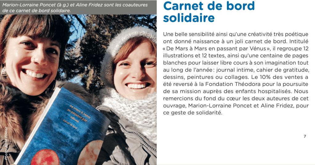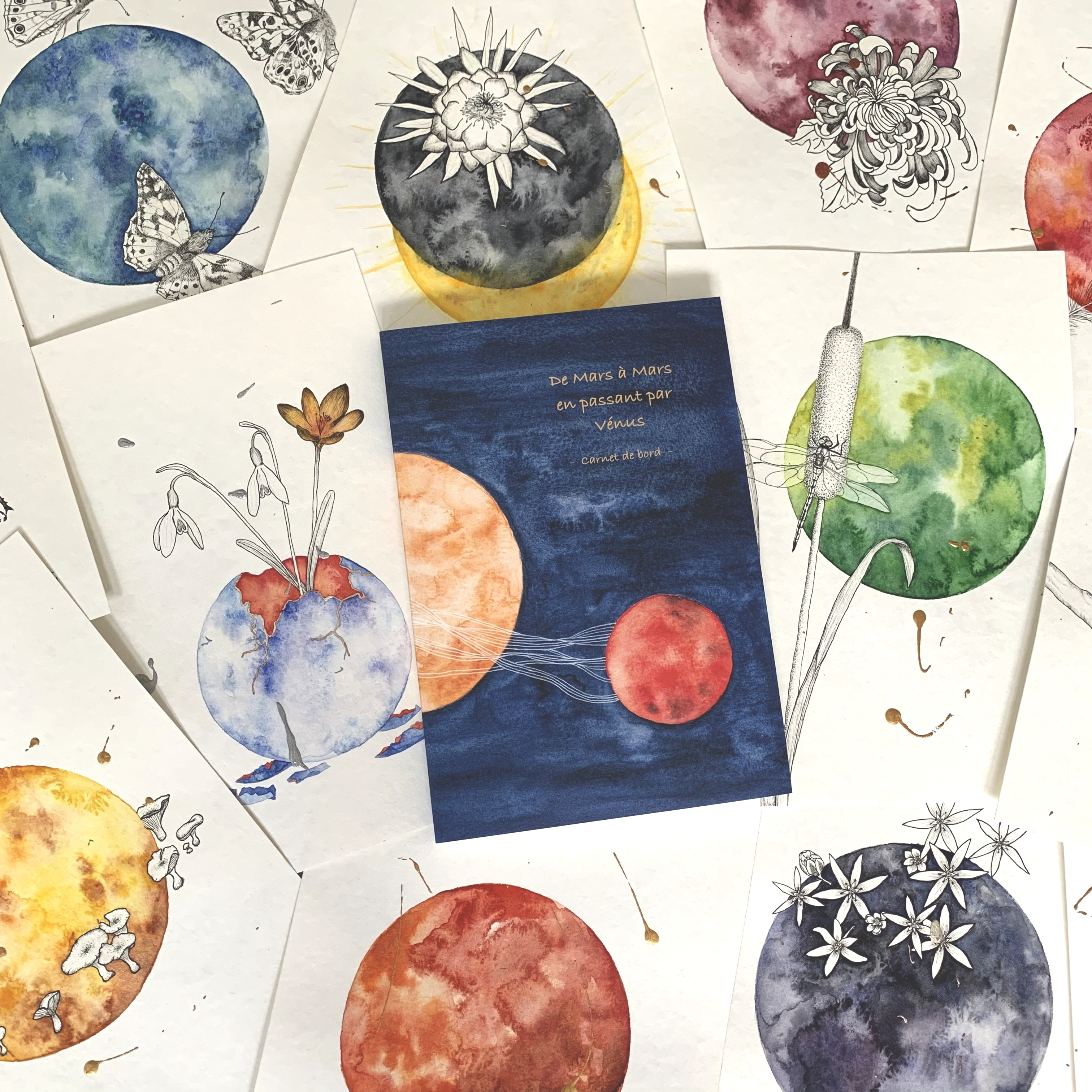 Carnet format A5, contenant 12 illustrations (moi-même) et 12 textes (Aline Fridez) ainsi qu’une centaine de pages blanche assez épaisses (120 g/m2) pour que le stylo « ne transperce pas ». Couverture souple et laminée pour que vous puissiez l’emporter partout avec vous. Imprimé et relié en Suisse par l’atelier Reliure des Planches à Ecublens (CH).