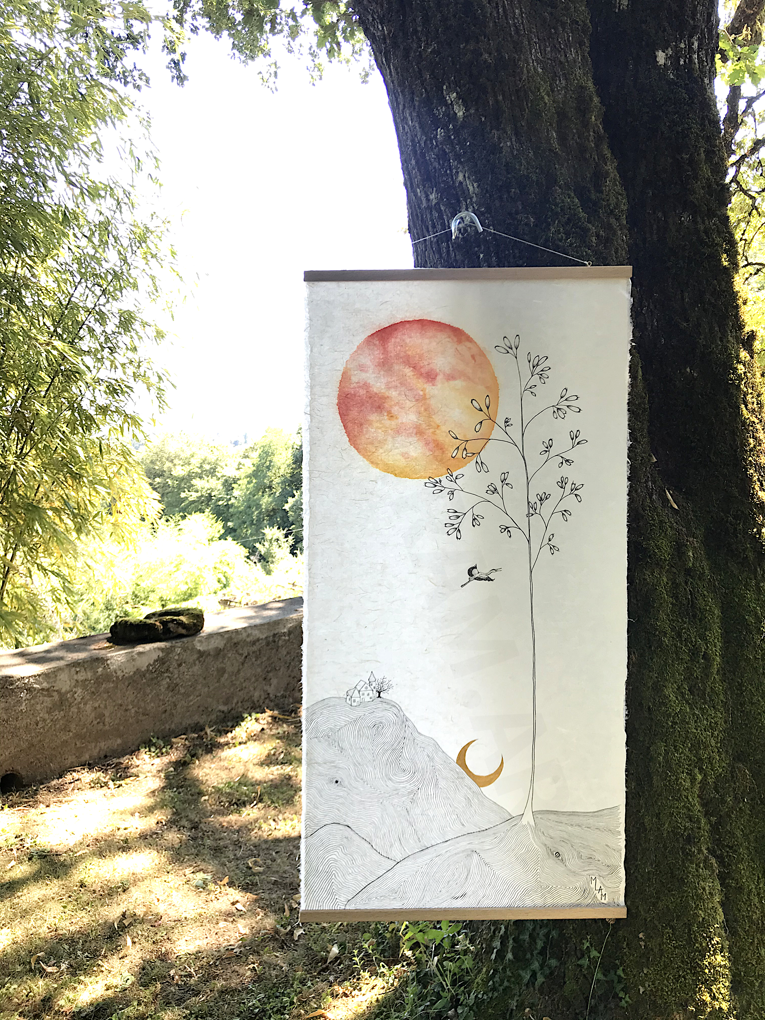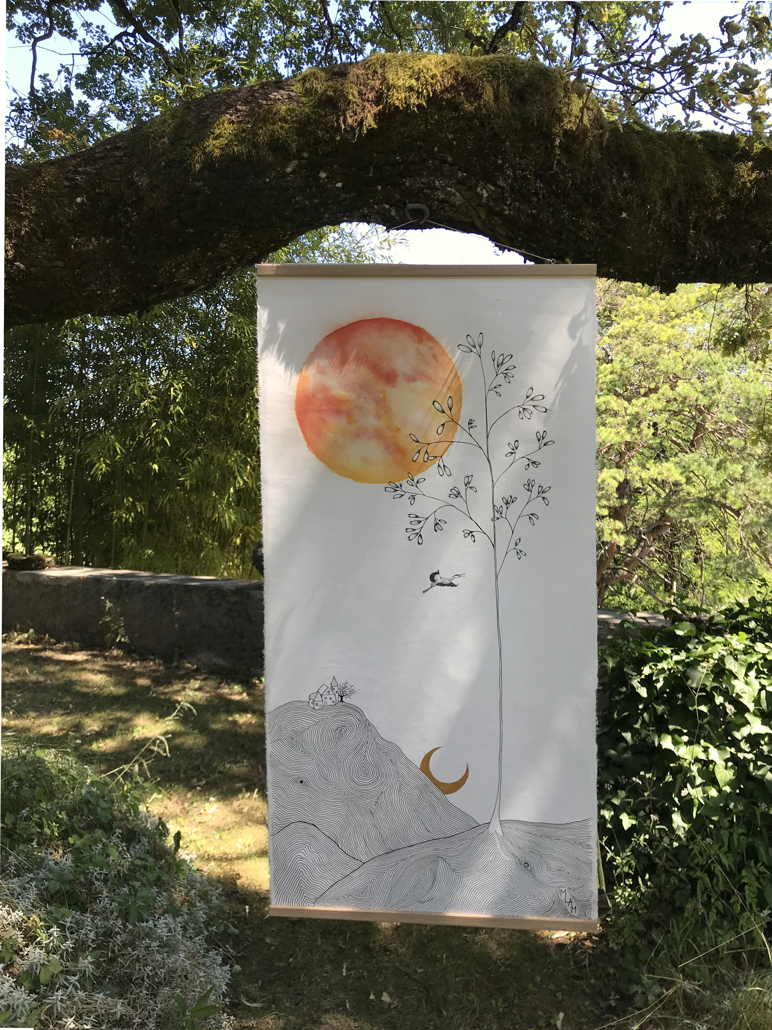 « J’aime ce jeu des échelles irréelles, du poids de la terre qui semble mouvante, qui semble aspirer la lune alors que l’oiseau et la plante s’envolent et que le soleil – mais ça peut aussi être une autre lune – stabilise le tout… j’aime ce grand vide médian qui relie le ciel et la terre, laisse respirer et circuler l’énergie…